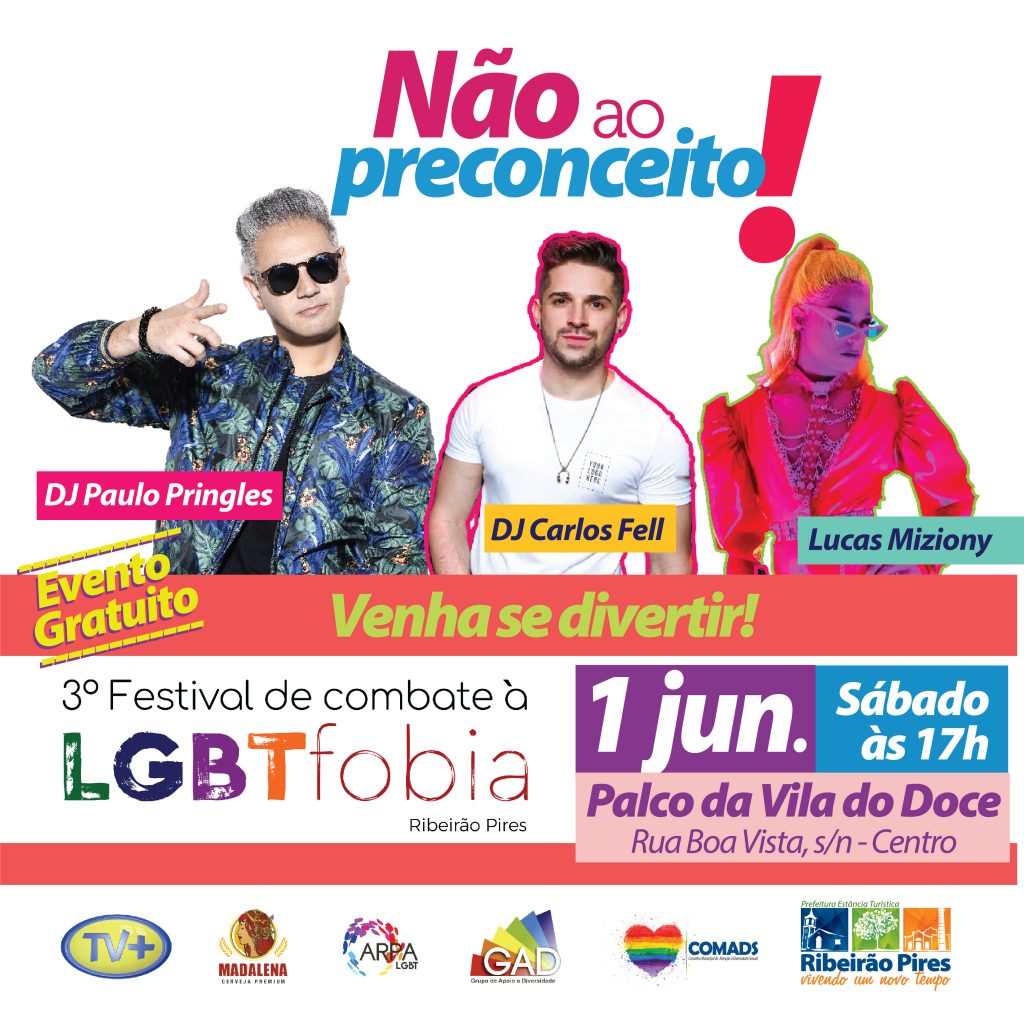 Nesse sábado, 1º de junho, acontecerá a terceira edição do Festival de Combate à LGBTfobia de Ribeirão Pires. O destaque da programação fica por conta das cantoras Lia Clark e Karol Conka. O evento, que tem entrada gratuita, acontecerá a partir das 17h, na Praça Central da Vila do Doce – Rua Boa Vista s/nº – Centro.