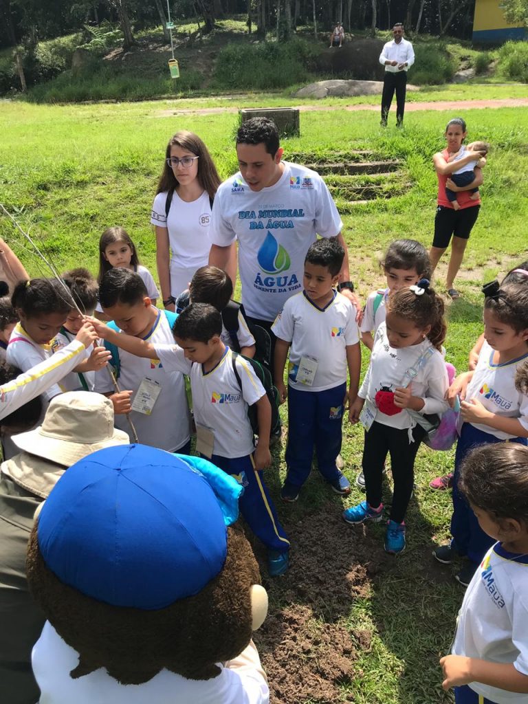 Gerente do parque (Renan Pessoa) com crianças no Dia Mundial da Água