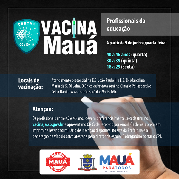 Terá início nesta quarta-feira (09/06) em Mauá grande frente de vacinação da primeira dose contra o coronavírus a profissionais da educação das redes municipal, estadual e privada. O público-alvo é po...