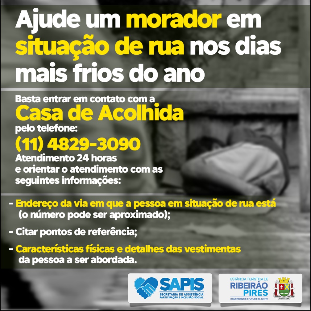 Quer ajudar as pessoas em situação de rua, principalmente, nos dias mais frios do ano? A Prefeitura da Estância TurĂstica de RibeirĂŁo Pires, por meio da Secretaria de AssistĂŞncia, Participação e Inclu...