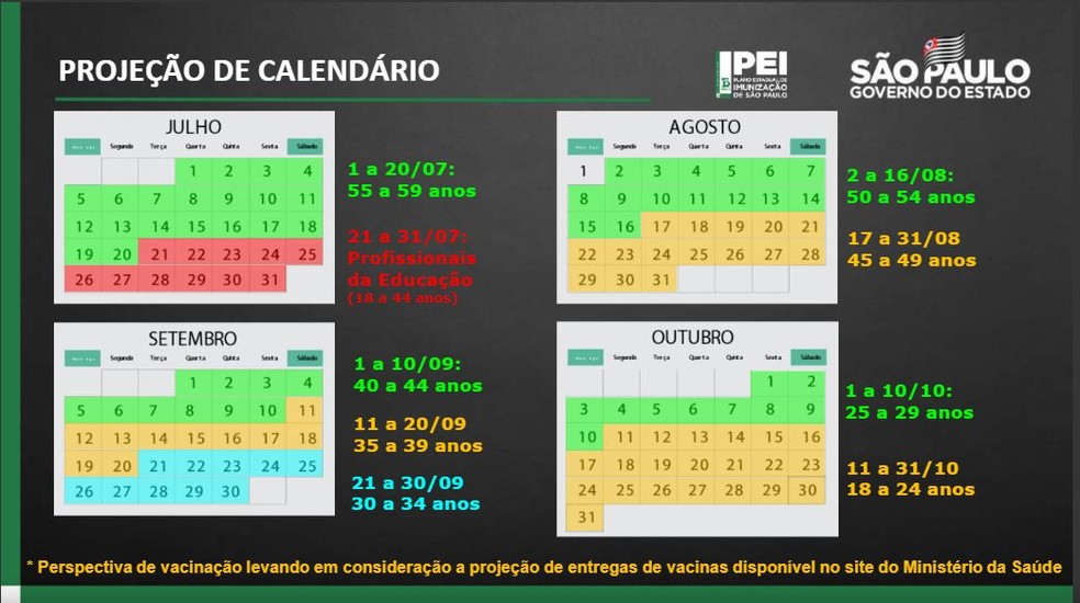 O governo de São Paulo anunciou nesta quarta-feira (2) as datas estimadas de vacinação de toda a população com mais de 18 anos no estado. Pelo calendário, toda a população adulta será vacinada até 31 ...