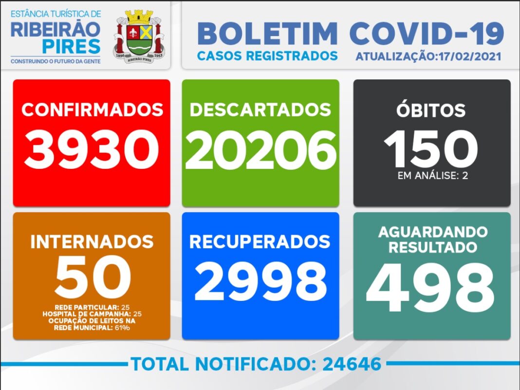 RibeirĂŁo Pires recebeu nesta quarta-feira, dia 17, 22 resultados positivos de coronavĂrus entre moradores da cidade, totalizando 3.930 casos confirmados da doença. 18 resultados negativos foram recebi...