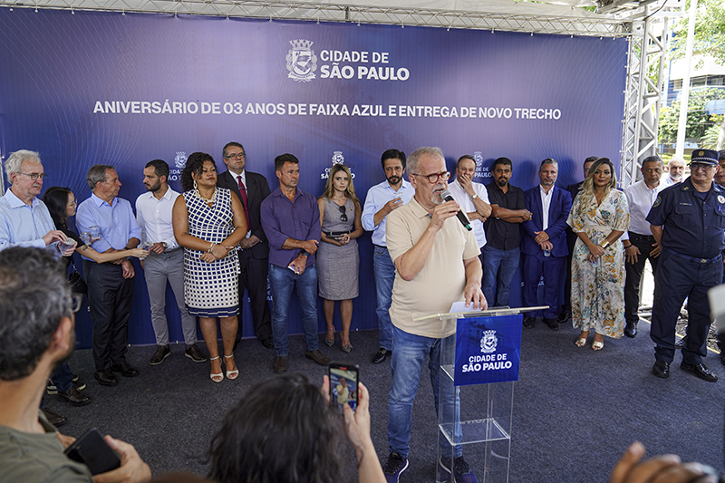 O presidente da Câmara Municipal de São Paulo, vereador Ricardo Teixeira (UNIÃO), representou o Legislativo na cerimônia. Ele foi responsável pela implantação da Faixa Azul na capital paulista, sendo que o primeiro corredor foi ativado em 25 de janeiro de 2022. O trecho inaugural tinha 5,5 km de extensão e foi implantado na avenida 23 de Maio, no sentido Aeroporto, entre a Praça da Bandeira e o Complexo Viário Jorge João Saad.