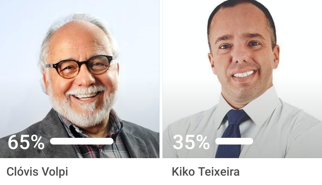 Em pesquisa popular, o pré-candidato a prefeitura de Ribeirão Pires/SP, Clóvis Volpi (PL), ganhou do atual Prefeito, Kiko (PSB). A votação teve 2.643 votos, sendo 1.710 (65%) para Volpi e 933 (35%) pa...