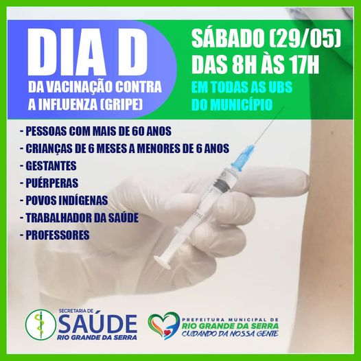 Dia D da Vacinação contra a Influenza (Gripe) será neste sábado (29) para grupos prioritários Neste sábado (29/05), será realizado em Rio Grande da Serra o Dia D da Vacinação Contra a Influenza (Gripe...