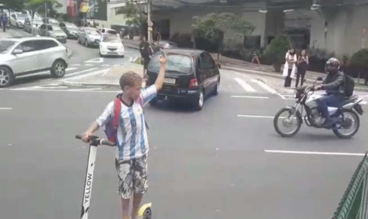 Uma criança, um apito e um patinete chamaram atenção no início da tarde desta quarta-feira no Bairro Belvedere, na Região Centro-Sul de Belo Horizonte. Enquanto uma falha atingia os semáforos da Rodov...
