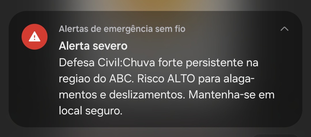 A Defesa Civil emitiu um alerta após chuvas fortes na região do Grande ABC, de acordo com a Defesa Civil, há alto risco para alagamentos e deslizamentos, o ideal é se manter em local seguro....