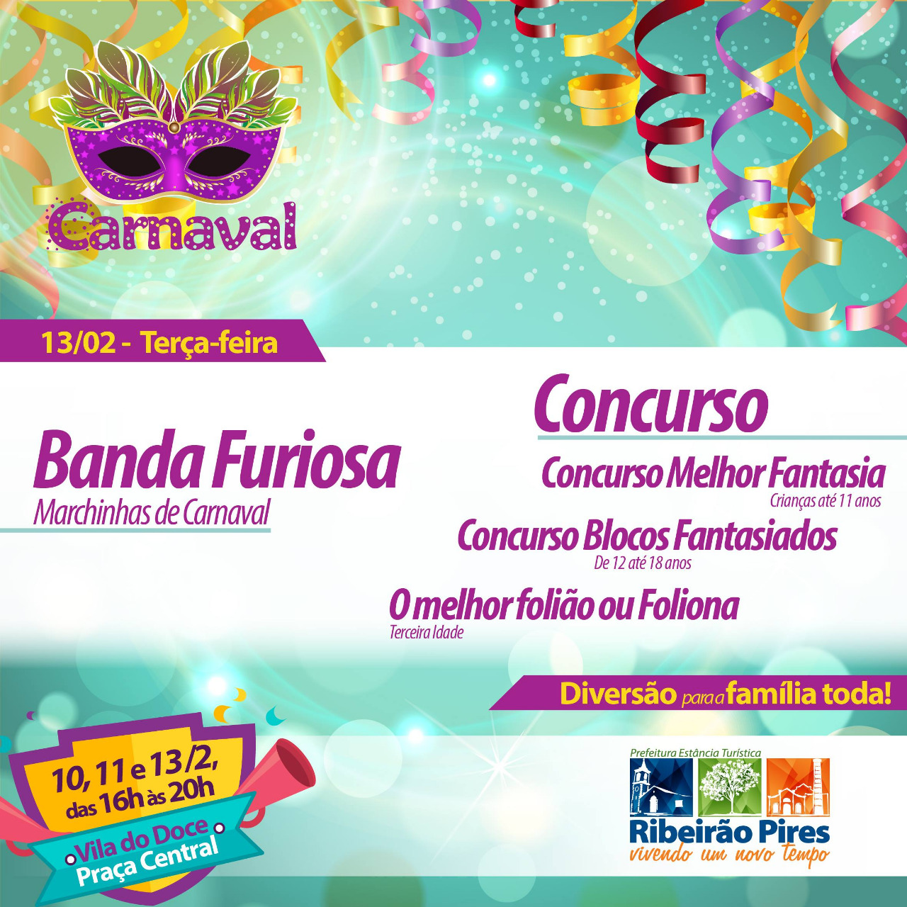A Prefeitura da Estância Turística de Ribeirão Pires oferece atividades para foliões de todas as idades. Nos dias 10, 11 e 13 de fevereiro, acontece a programação de Carnaval da cidade, das 16h às 20h, na Vila do Doce – Rua Boa Vista, s/nº – Centro.
