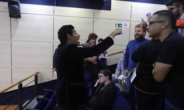 Em meio a discussões acaloradas entre opositores e defensores das causas LGBT, o presidente da Câmara, Pio Mielo (PSD), interrompeu a sessão por 10 minutos e ameaçou “vazio o plenário”.