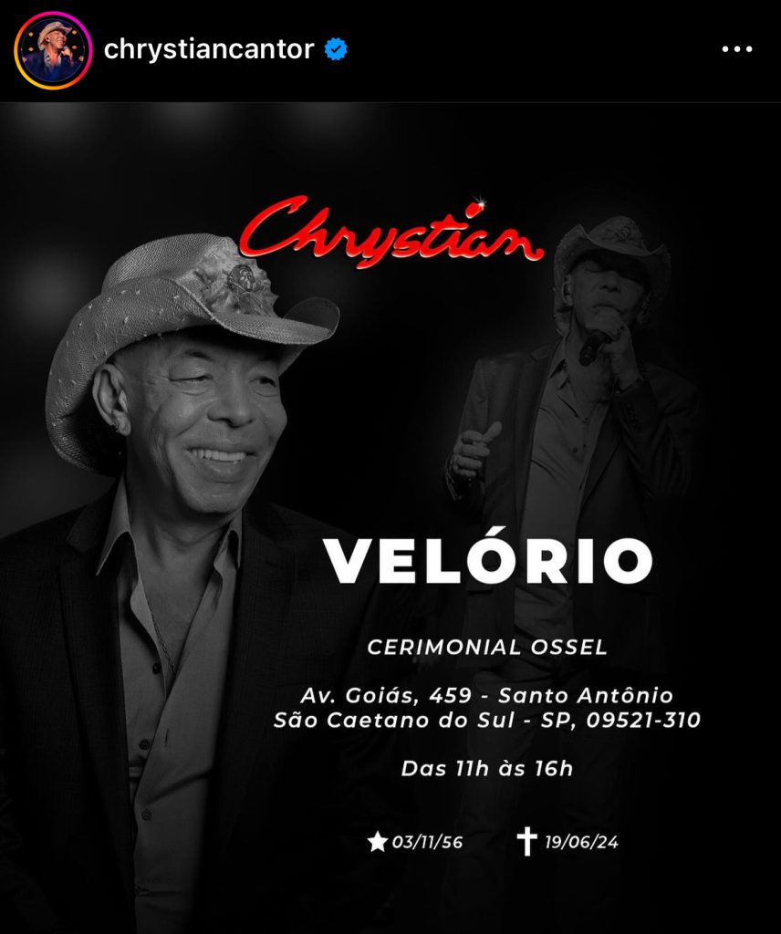 O cantor faleceu na noite desta quarta-feira (19), após um mal súbito, seguido de uma parada cardiorrespiratória. Chrystian tinha 67 anos.