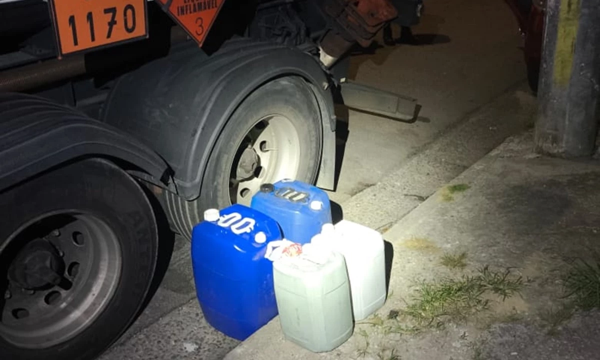 Segundo a Polícia Militar, um grupo da Primeira Companhia estava em patrulhamento quando se deparou com um Renault Sandero vermelho com o porta-malas destravado ao lado de um caminhão tanque. Quando notou a aproximação dos agentes, o suspeito tentou se ocultar atrás do carro, mas acabou sendo abordado. No veículo, existiam vários recipientes com etanol.