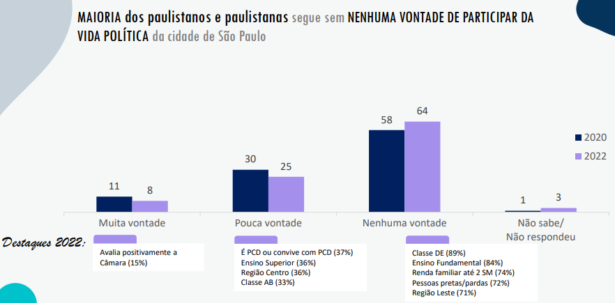 Segundo pesquisa realizada pela Rede Nossa SP e divulgada nesta terça-feira (24), nove em cada dez paulistanos têm pouca ou nenhuma vontade de participar de vida política da cidade de São Paulo.