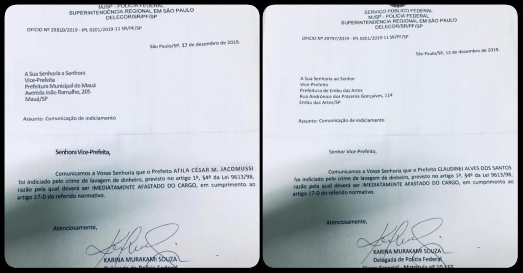 Um documento da PolĂcia Federal destinado ao vice-prefeito de Embu das Artes, Peter sobre o indiciamento do prefeito, Ney Santos foi motivo de montagem em Mauá usando o nome do prefeito, Atila Jacomussi.