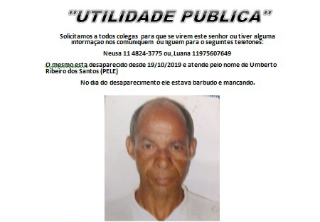 O senhor Umberto Ribeiro dos Santos está desaparecido desde o último dia 19 de outubro, de acordo com sua sobrinha Luana que registrou o Boletim de ocorrência. O homem mora no Jardim São Francisco em Ribeirão Pires