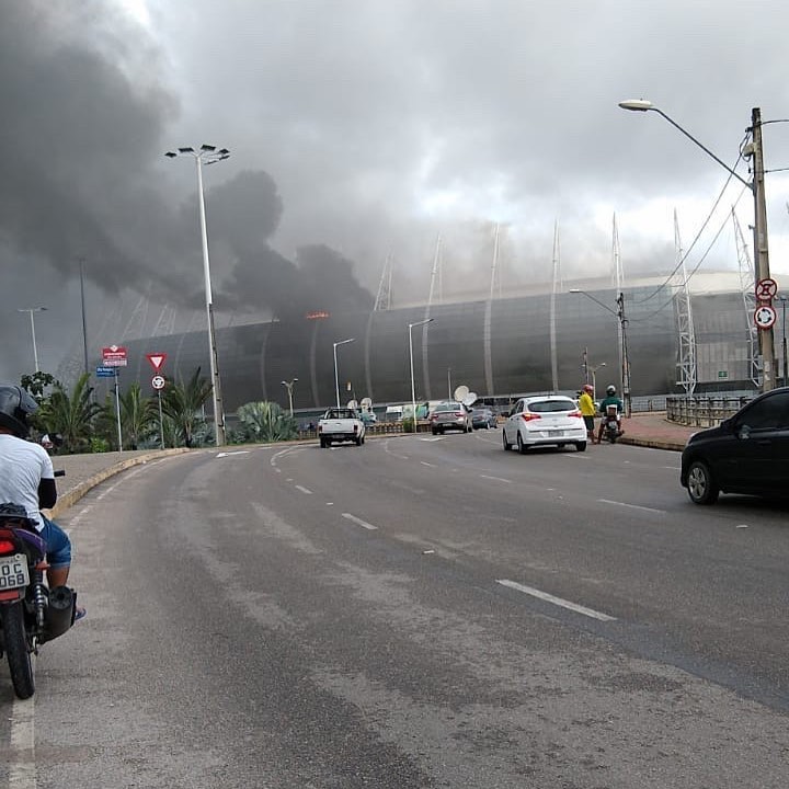 Um incêndio atinge a área interna da Arena Castelão, em Fortaleza, na manhã deste sábado (30). O fogo atingiu uma cabine de rádio. Duas guarnições do Corpo de Bombeiros trabalham no local para controlar o fogo.