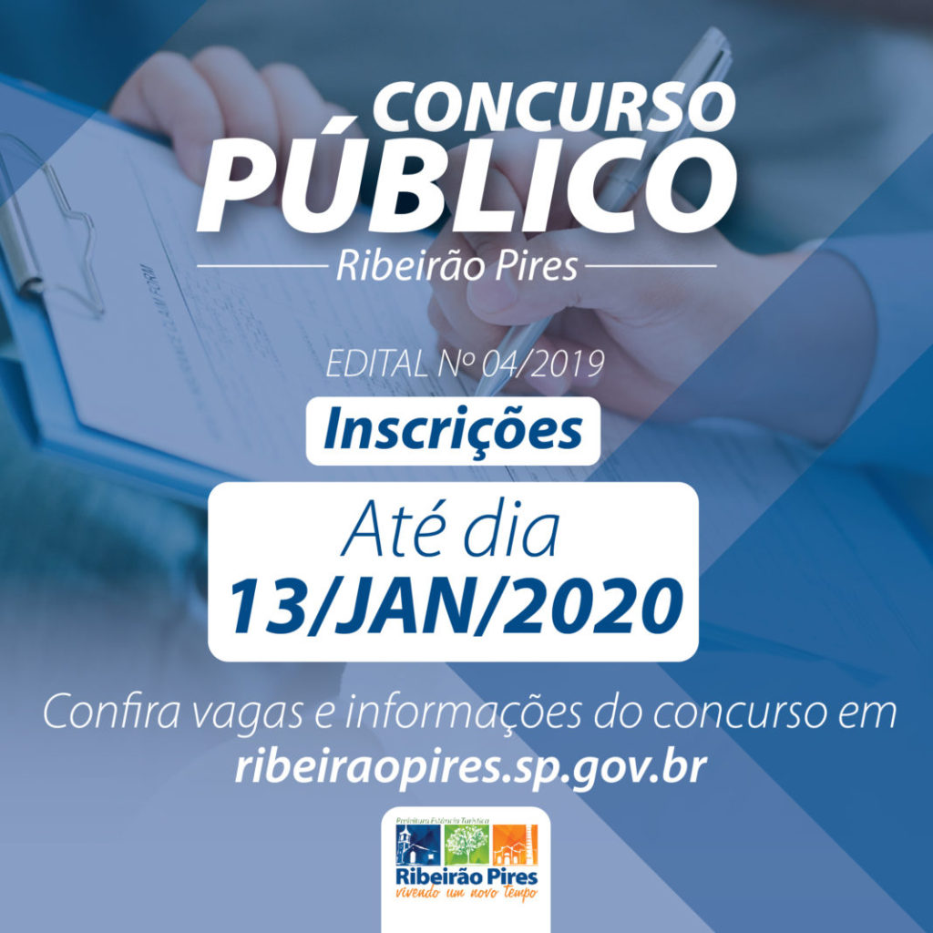 As inscrições do Concurso Público para diversos cargos da Prefeitura da Estância Turística de Ribeirão Pires seguem abertas até dia 13 de janeiro de 2020, às 17h, conforme Edital nº 04/2019. Os interessados poderão se inscrever somente pelo site do Instituto Mais de Gestão e Desenvolvimento Social – www.institutomais.org.br.