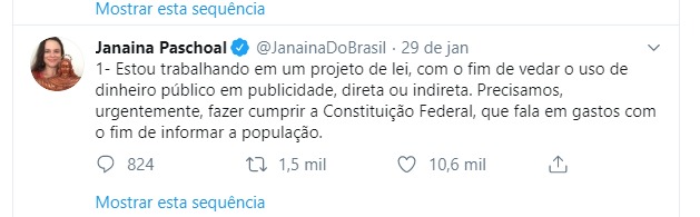 A deputada estadual, Janaina Paschoal – autora do pedido do impeachment da Dilma- prepara um Projeto de Lei estadual para proibir a publicidade do Governo de forma direta ou indireta. A Adjori-SP (Associações de Jornais do Interior do Estado de São Paulo), emitiu Nota Pública sobre sua intenção.