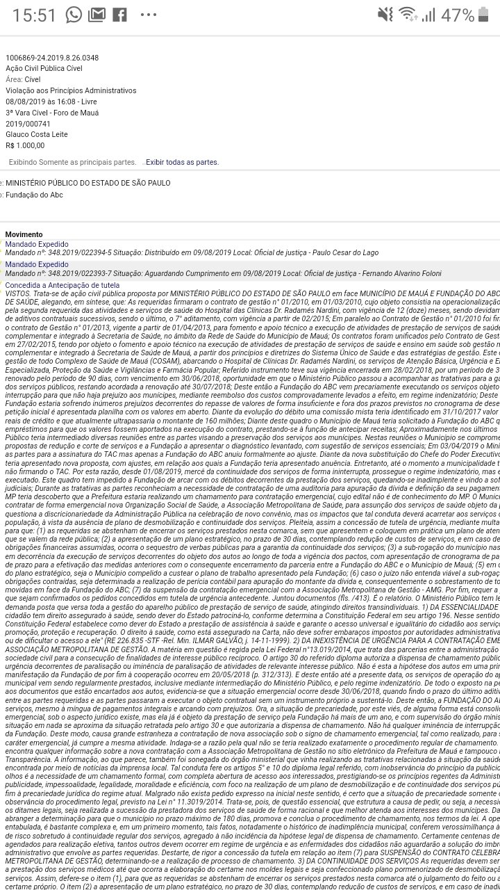 . Trata-se de ação civil pública proposta por MINISTÉRIO PÚBLICO DO ESTADO DE SÃO PAULO em face MUNICÍPIO DE MAUÁ E FUNDAÇÃO DO ABC – ORGANIZAÇÃO SOCIAL DE SAÚDE, alegando, em síntese, que: As requeridas firmaram o contrato de gestão n° 01/2010, em 01/03/2010, cujo objeto consistia na operacionalização da gestão e execução pela segunda requerida das atividades e serviços de saúde do Hospital das Clínicas Dr. Radamés Nardini, com vigência de 12 (doze) meses, sendo devidamente prorrogado por meio de aditivos contratuais sucessivos, sendo o último, o 7° aditamento, com vigência a partir de 02/2015; Em paralelo ao Contrato de Gestão n° 01/2010 foi firmado entre as requeridas o contrato de Gestão n° 01/2013, vigente a partir de 01/04/2013, para fomento e apoio técnico a execução de atividades de prestação de serviços de saúde, em caráter complementar e integrado à Secretaria de Saúde, no âmbito da Rede de Saúde do Município de Mauá; Os contratos foram unificados pelo Contrato de Gestão n° 01/2015, celebrado em 27/02/2015, tendo por objeto o fomento e apoio técnico na execução de atividades de prestação de serviços de saúde e ensino em saúde sob gestão municipal, em caráter complementar e integrado à Secretaria de Saúde de Mauá, a partir dos princípios e diretrizes do Sistema Único de Saúde e das estratégias de gestão. Este contrato englobava a gestão de todo Complexo de Saúde de Mauá (COSAM), abarcando o Hospital de Clínicas Dr. Radamés Nardini, os serviços de Atenção Básica, Urgência e Emergência, Atenção Especializada, Proteção da Saúde e Vigilâncias e Farmácia Popular; Referido instrumento teve sua vigência encerrada em 28/02/2018, por um período de 30 dias e, posteriormente renovado pelo período de 90 dias, com vencimento em 30/06/2018, oportunidade em que o Ministério Público passou a acompanhar as tratativas para a garantia da continuidade dos serviços públicos, restando acordada a renovação até 30/07/2018; Deste então a Fundação do ABC vem precariamente executando os serviços objeto do contrato, sem interrupção para que não haja prejuízo aos munícipes, mediante reembolso dos custos comprovadamente levados a efeito, em regime indenizatório; Deste o início da contratação a Fundação estaria sofrendo inúmeros prejuízos decorrentes do repasse de valores de forma insuficiente e fora dos prazos previstos no cronograma de desembolso. Às págs 6 e 7 da petição inicial é apresentada planilha com os valores em aberto. Diante da evolução do débito uma comissão mista teria identificado em 31/10/2017 valor superior a 110 milhões de reais de crédito e que atualmente ultrapassaria o montante de 160 milhões; Diante deste quadro o Município de Mauá teria solicitado à Fundação do ABC que contraísse empréstimos para que os valores fossem aportados na execução do contrato, prestando-se à função de antecipar receitas; Aproximadamente nos últimos 12 meses o Ministério Público teria intermediado diversas reuniões entre as partes visando a preservação dos serviços aos munícipes. Nestas reuniões o Município se comprometia a apresentar propostas de redução e corte de serviços e a Fundação a apresentar o diagnóstico levantado, com sugestão de serviços essenciais; Em 03/04/2019 o Ministério Público convocou as partes para a assinatura do TAC mas apenas a Fundação do ABC anuiu formalmente ao ajuste. Diante da nova substituição do Chefe do Poder Executivo Municipal, a prefeitura teria apresentado nova proposta, com ajustes, em relação aos quais a Fundação teria apresentado anuência. Entretanto, até o momento a municipalidade teria se mantido inerte, não firmando o TAC. Por esta razão, desde 01/08/2019, mercê da continuidade dos serviços de forma ininterrupta, prossegue o regime indenizatório, mas em valores aquém do executado. Este quadro tem impedido a Fundação de arcar com os débitos decorrentes da prestação dos serviços, quedando-se inadimplente e vindo a sofrer diversos bloqueios judiciais; Durante as tratativas as partes reconheciam a necessidade de contratação de uma auditoria para apuração da dívida e definição da seu pagamento; Apesar das tratativas o MP teria descoberto que a Prefeitura estaria realizando um chamamento para contratação emergencial, cujo edital não é de conhecimento do MP. O Município teria decidido contratar de forma emergencial nova Organização Social de Saúde, a Associação Metropolitana de Saúde, para assunção dos serviços de saúde objeto da presente lide; O MP não questiona a discricionariedade da Administração Pública na celebração de novo convênio, mas os impactos que tal conduta deverá acarretar aos serviços de saúde prestados à população, à vista da ausência de plano de desmobilização e continuidade dos serviços. Pleiteia, assim a concessão de tutela de urgência, mediante multa diária de R$ 50.000,00, para que: (1) as requeridas se abstenham de encerrar os serviços prestados nesta comarca, sem que apresentem e coloquem em prática um plano de atendimento aos munícipes que se valem da rede pública; (2) a apresentação de um plano estratégico, no prazo de 30 dias, contemplando redução de custos de serviços, e em caso de inadimplemento das obrigações financeiras assumidas, ocorra o sequestro de verbas públicas para a garantia da continuidade dos serviços; (3) a sub-rogação do município nas obrigações contraídas em decorrência da execução de serviços decorrentes do objeto dos autos ao longo de toda a vigência dos pactos, com apresentação de cronograma de pagamentos; (4) delimitação de prazo para a efetivação das medidas anteriores com o consequente encerramento da parceria entre a Fundação do ABC e o Município de Mauá; (5) em caso de não apresentação do plano estratégico, seja o Município compelido a custear o plano de trabalho apre