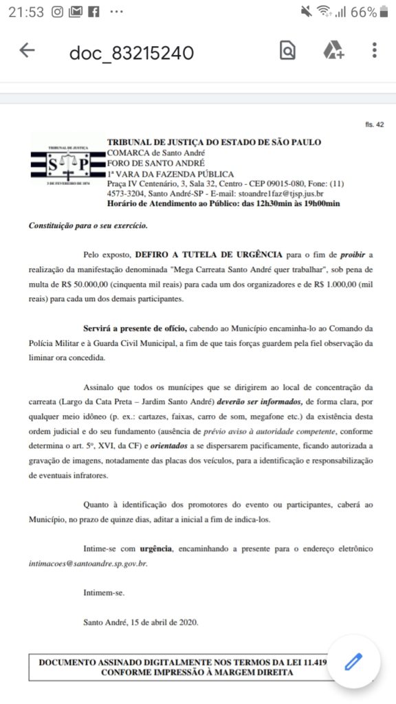 o juiz da 1° Vara de Fazenda Pública de Santo André, Jenilson Rodrigues Carreiro, deferiu uma liminar suspendendo a carreta organizada para amanhã (16/4) às 13h, sob pena de multa de R$ 5 mil para os organizadores e R$ 1 mil para os participantes.