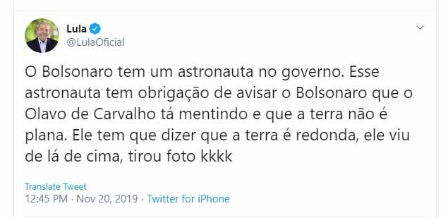 O ex-presidente, Luiz Inácio Lula da Silva, publicou no início da tarde deste 20 de novembro em seu twitter, uma “tirrada” da cara do Bolsonaro e dos seguidores de Olavo de Carvalho que insistem em dizer que a Terra é plana.
