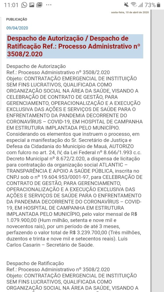 A Prefeitura de Mauá firmou contrato emergencial com a OS (Organização Social), ATLANTIC – TRANSPARÊNCIA E APOIO A SAÚDE PÚBLICA, no valor de 1.079.900,00 (um milhão, setenta e nove mil e novecentos rais), por um período de até 3 meses, tendo seu valor total de R$ 3.239.700,00 (Três milhões, duzentos e trinta e nove mil e setecentos reais).