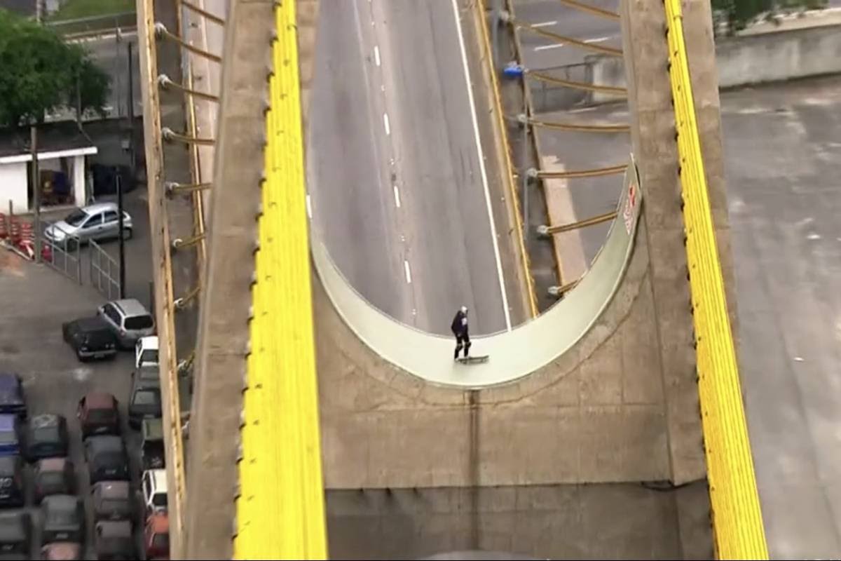 O motorista que passou pela ponte Governador Orestes Quércia, conhecida como Estaiadinha, na manhã desta terça-feira (19) teve a oportunidade de assistir, mesmo que rapidamente, o craque Sandro Dias, o Mineirinho, andando de skate no arco côncavo que compõe a estrutura. A ação busca promover a Virada Esportiva de São Paulo, que acontece neste fim de semana com 120 modalidades em 2 mil eventos espalhados pela cidade.