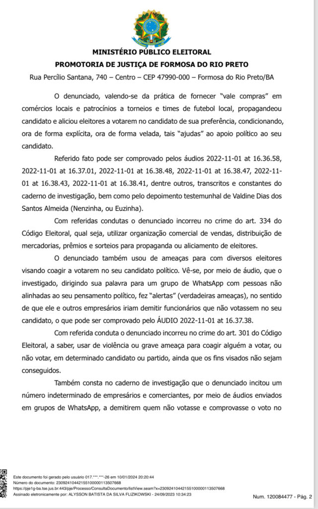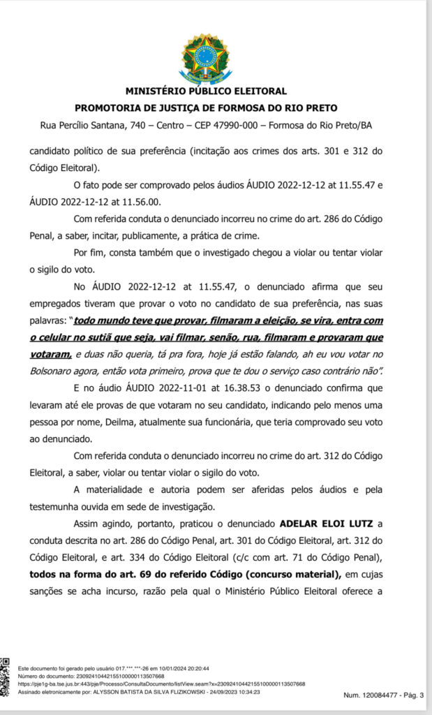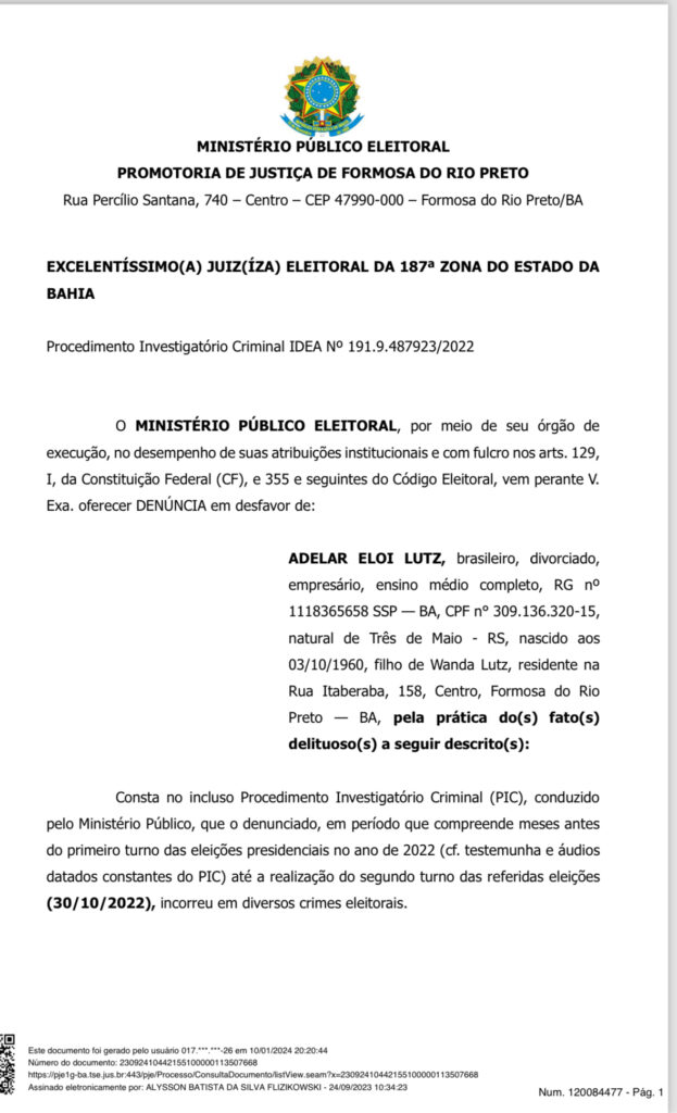 O Ministério Público, por meio do promotor Alysson Batista da Silva Flizikowski, ofereceu denúncia contra o empresário do agronegócio Adelar Eloi Lutz, após conclusão do Procedimento Investigatório Criminal (PIC). A investigação revelou que, durante o período que antecedeu o primeiro turno das eleições presidenciais de 2022 até a realização do segundo turno, o denunciado cometeu diversos crimes eleitorais.