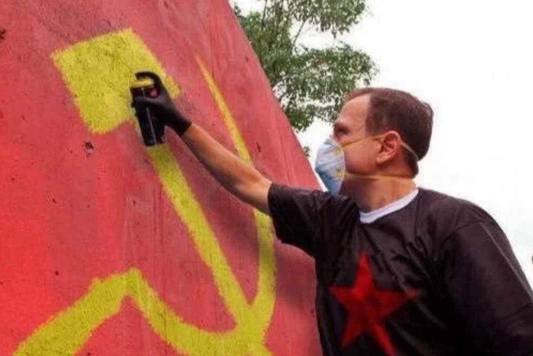 Uma montagem do governador de São Paulo, João Doria (PSDB), grafitando o sÃmbolo do comunismo ganhou mais de 10 mil compartilhamentos no Facebook em pouco mais de 24 horas. A imagem editada usa uma foto de quando Doria ainda era prefeito da capital paulista, de 2017, na inauguração de uma área de Museu de Arte de Rua (MAR) na Vila Gustavo, Zona Norte.