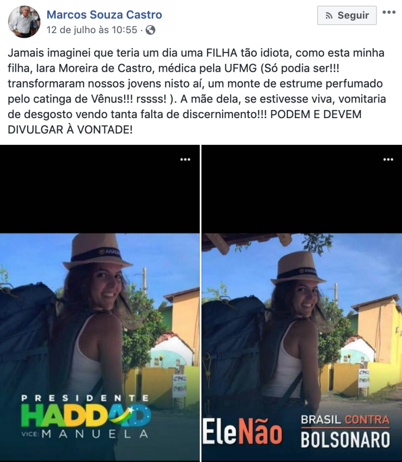 “Minha filha, minha vergonha!”. Essa foi uma das formas escolhidas pelo professor de idiomas Marcos Souza Castro para apresentar sua filha, Iara Moreira de Castro, e opção política dela em seu perfil no Facebook.