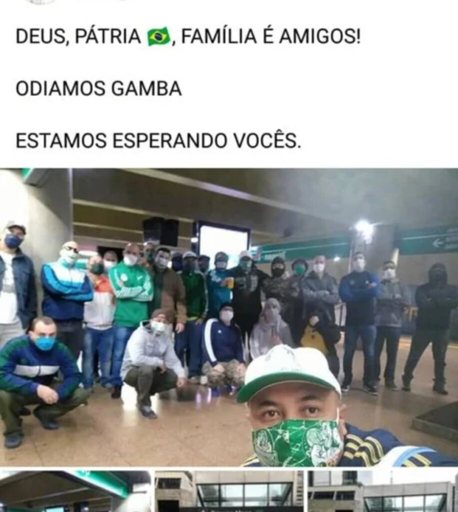 Na foto divulgada pelo grupo nas redes sociais, se lê a seguinte legenda: “Deus, Pátria (bandeira do Brasil), Família é Amigos! Odiamos gamba, estamos esperando vocês”.