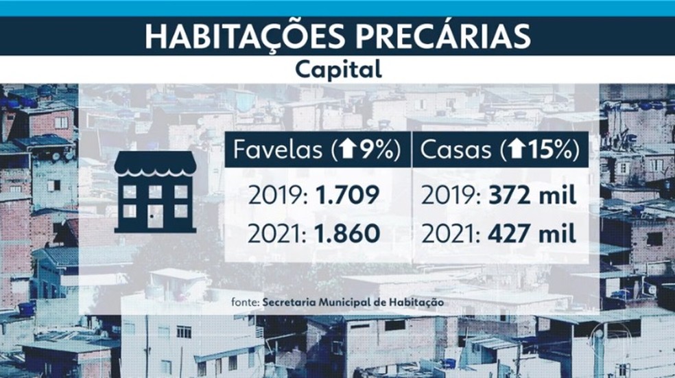 De acordo com os números, no fim de 2019 havia 372 mil famílias vivendo em moradias precárias da cidade, distribuídas em mais de 1.700 favelas de São Paulo. Em 2021, esse número passou para 427 mil casas em 1.860 comunidades, boa parte delas com problemas de saneamento básico e segurança.