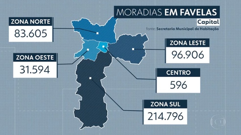A região central, até pelo grande número de empresas e pouca área desocupada, é a que tem menos casas em favela, segundo o levantamento da pasta da habitação.