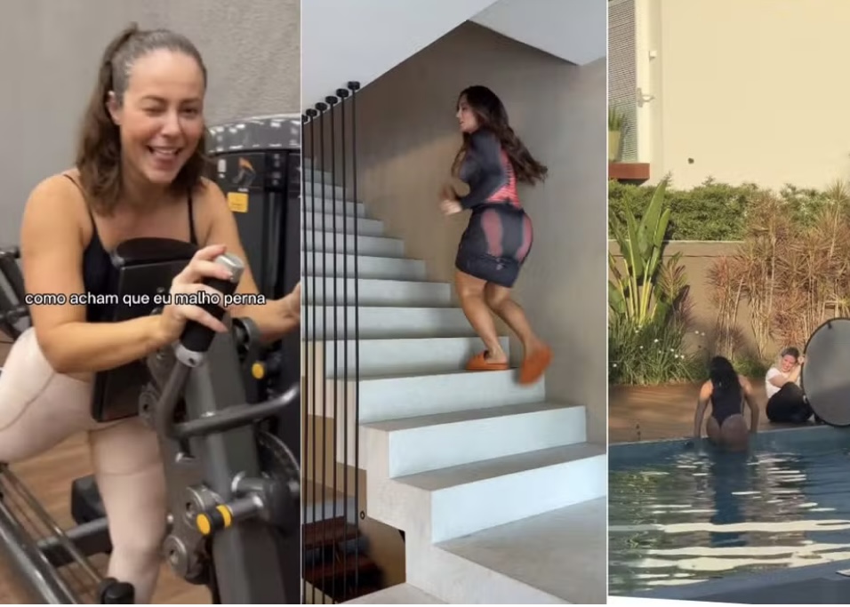 Na publicação, Paolla começa com a seguinte questão, enquanto malha em um aparelho na academia: “Como acham que eu malho perna”. Depois, ela mostra uma sequência de “corres” dentro de casa, subindo e descendo escadas, correndo para lá e para cá e até tentando sair da piscina com a força de um impulso. Tudo isso, acreditem, a trabalho!