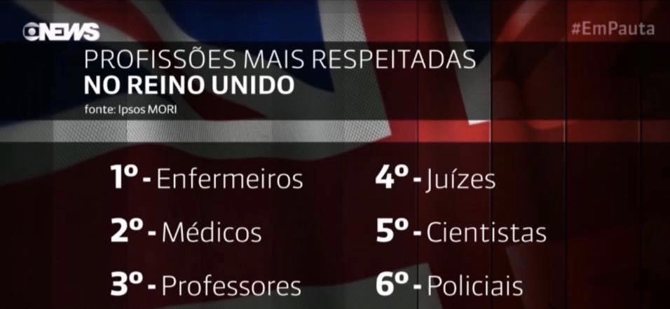 O Ipsos MORI do Reino Unido divulgou uma pesquisa com a população das profissões que os britânicos mais confiam.