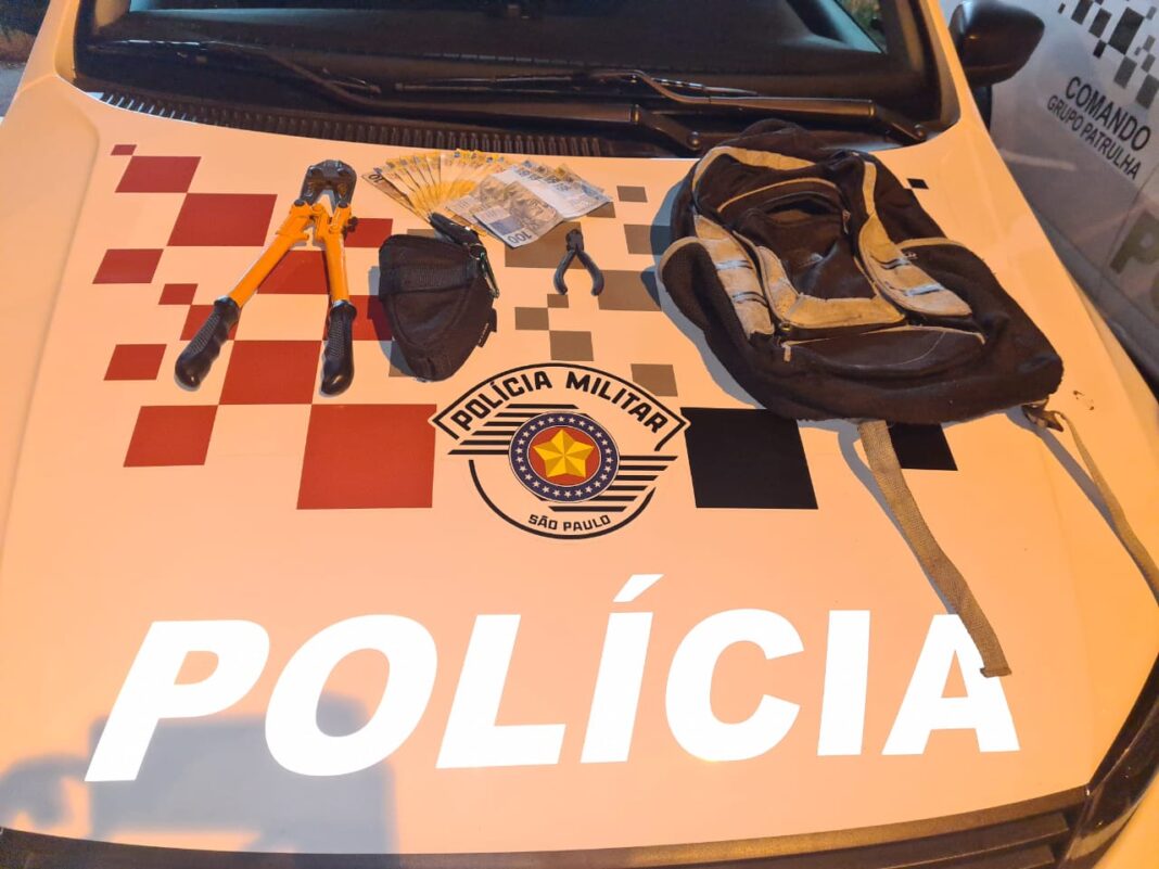 Ao chegar no condomínio, visualizaram 4 indivíduos, estando um deles em uma bicicleta, e ao notarem a presença da viatura iniciaram fuga, sendo possível abordar 1 que estava em uma bicicleta, em revista pessoal, foi localizado em sua mochila, ferramentas de corte, utilizadas para arrombamentos, e a quantia de R$ 910,00 reais, em outro menor, na busca pessoal nada de ilícito fora encontrado, tendo outros dois se evadido do local.