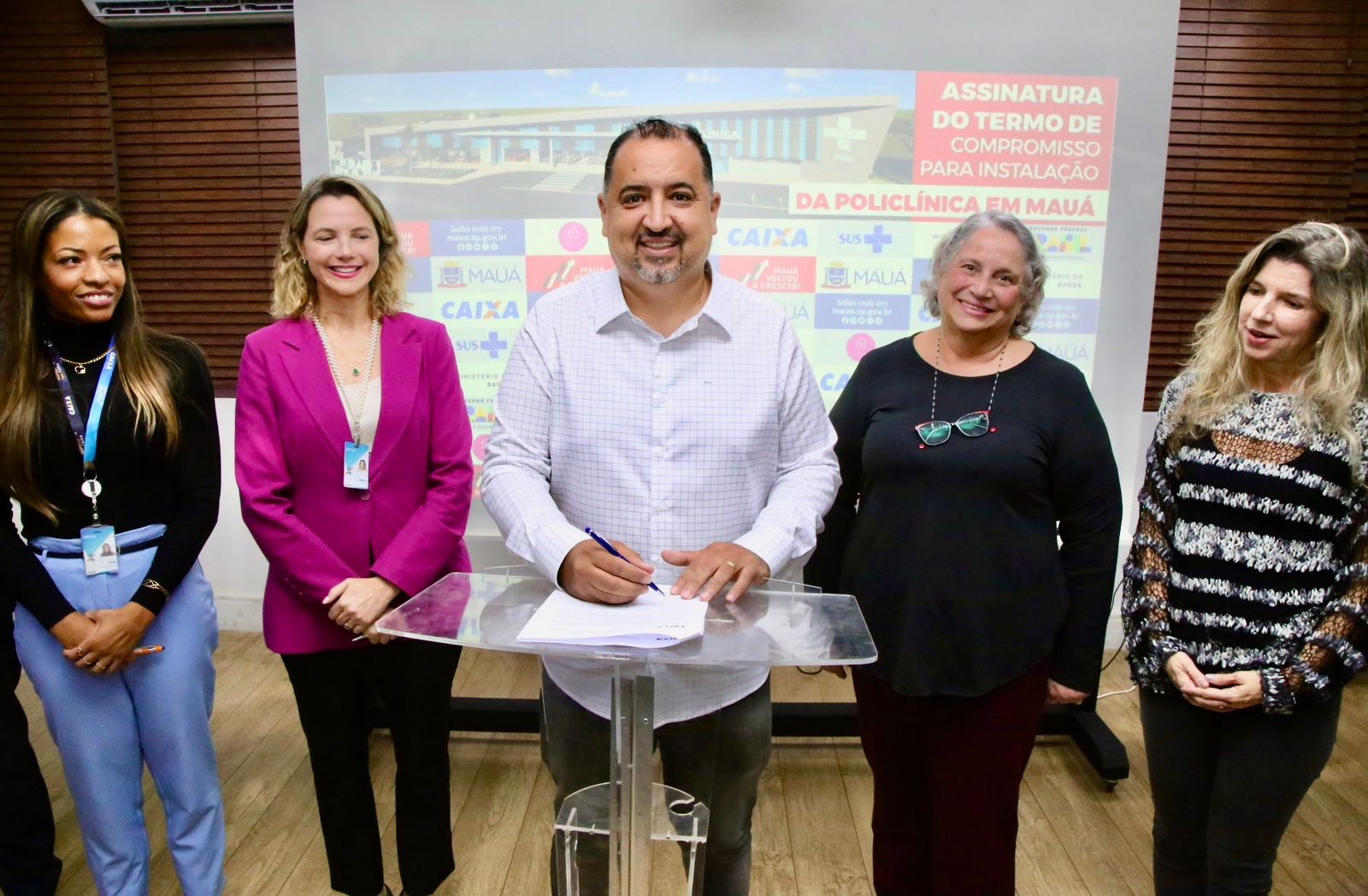 Um grande passo para a modernização e a humanização da saúde pública de Mauá, assim podemos classificar a atividade ocorrida na tarde desta quinta-feira (27/06). Foi assinado pelo prefeito Marcelo Oliveira, o termo de compromisso entre a Prefeitura e a Caixa Econômica Federal para viabilizar a construção da Policlínica da cidade. Um grande complexo de saúde que deve oferecer centenas de procedimentos, como exames, consultas e pequenas cirurgias, de dezenas de especialidades em um único espaço. Mauá é a primeira cidade do Grande ABC a celebrar um convênio pactuado no novo PAC (Programa de Aceleração do Crescimento) do Governo Federal. Representaram a Caixa, Maria Cláudia Casselli, Superintendente Regional, Cezar Arruda, Superintendente Executivo de Governo, e Ana Carolina, Gerente de Filial.