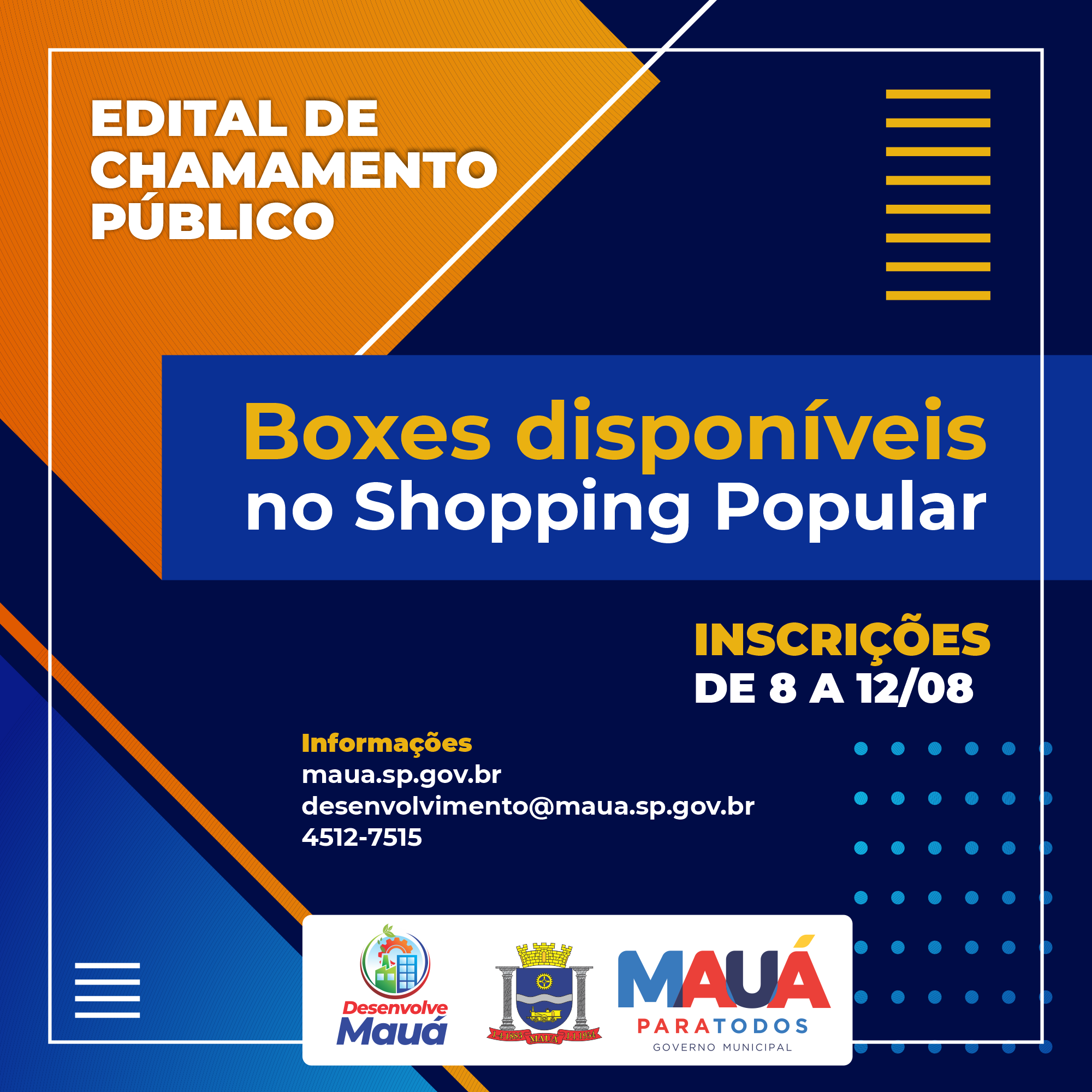 A Prefeitura de Mauá abre, a partir de segunda-feira (08/08), as inscrições aos interessados em comercializar produtos e serviços no Shopping Popular. Ao todo são 90 boxes disponíveis e os empreendedores podem consultar o edital publicado nesta terça-feira (02/08) no Diário Oficial do Município: http://dom.maua.sp.gov.br/pPublicacao.aspx?ID=37121.