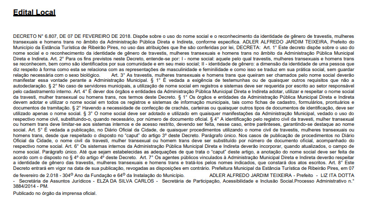 O decreto N° 6.807, publicado hoje (23/03) no Diário Ofical da Prefeitura de Ribeirão Pires, assinado pelo prefeito Kiko Teixeira (PSB), dá o direito ao reconhecimento da identidade de gênero de travestis, mulheres transexuais e homens trans no âmbito da Administração Pública Direta e Indireta.