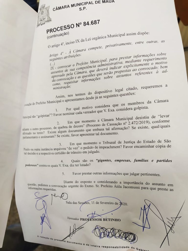 Um requerimento de autoria do vereador de Mauá, professor Betinho (DC), quer a convocação do prefeito, Atila Jacomussi (PSB), para se explicar sobre a acusações feitas nas redes sociais contra o legislativo. O documento está na Ordem do Dia e entra em votação amanhã (18/02).