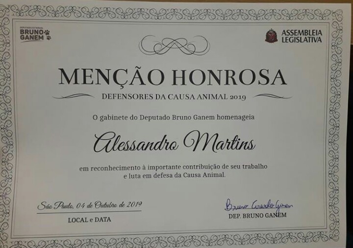 O protetor de animais, Alessandro Martins, da cidade de Mauá, no ABC Paulista, foi homenageado pela Assembleia Legislativa do Estado de São Paulo no dia Mundial dos protetores de animais e dia de São Francisco de Assis.