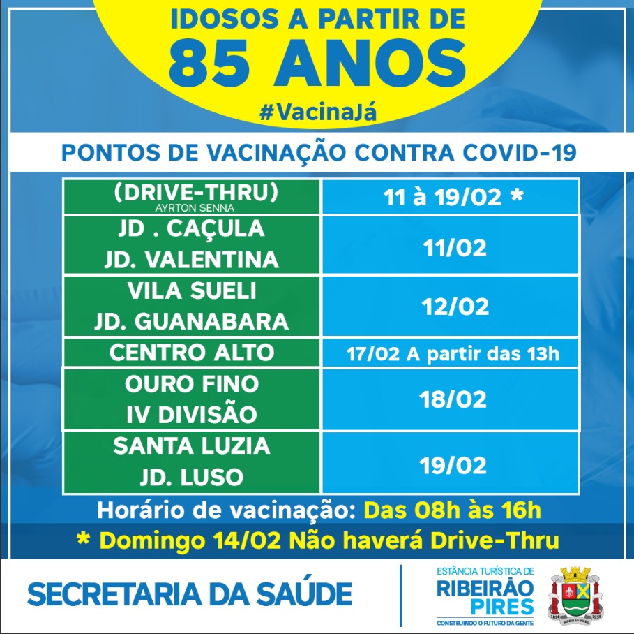 A Secretaria de Saúde de Ribeirão Pires adiantou a imunização dos idosos a partir de 85 anos e divulgou nesta quarta-feira (11), o cronograma completo de vacinação, que começa amanhã, dia 11 de fevereiro e vai até o dia 19 do mesmo mês.