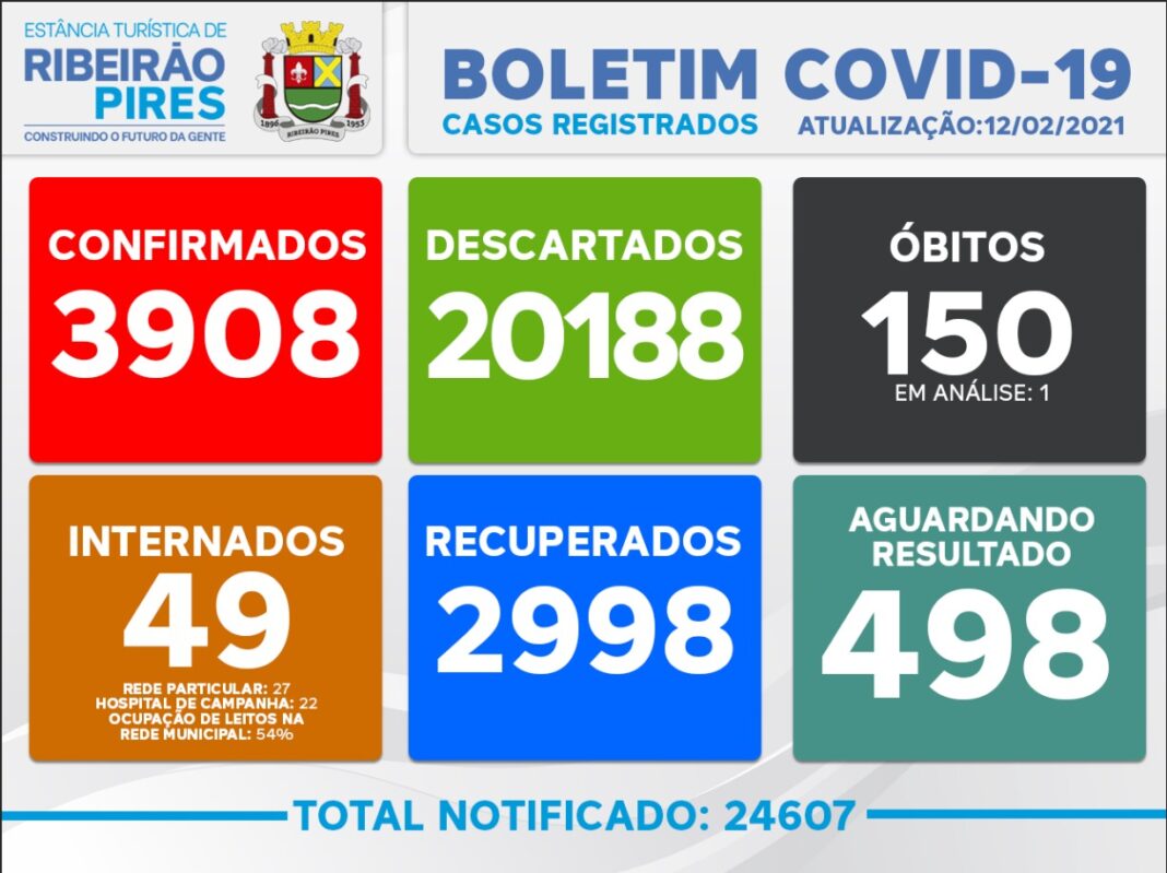 Ribeirão Pires recebeu nesta sexta-feira, dia 12, 9 resultados positivos de coronavírus entre moradores da cidade, totalizando 3.908 casos confirmados da doença. 21 resultados negativos foram recebidos, totalizando 20.188 casos descartados. Há 498 suspeitas em análise de laboratório, incluindo 1 óbitos. A cidade mantém 150 óbitos confirmados.