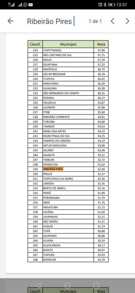 O que chamou atenção foi a posição da Estância Turística de Ribeirão Pires que despencou no Ranking geral e amargou o 249º posição com 32,48 pontos no Estado. Ficando atrás de Mauá e São Caetano do Sul.
