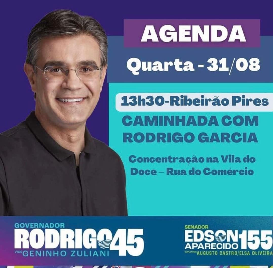 O governador do Estado de São Paulo e candidato à reeleição Rodrigo Garcia (PSDB) realizará na tarde desta quarta-feira, dia 31, em Ribeirão Pires. O prefeito Clovis Volpi (PL) fez o anuncio por meio de suas redes sociais.