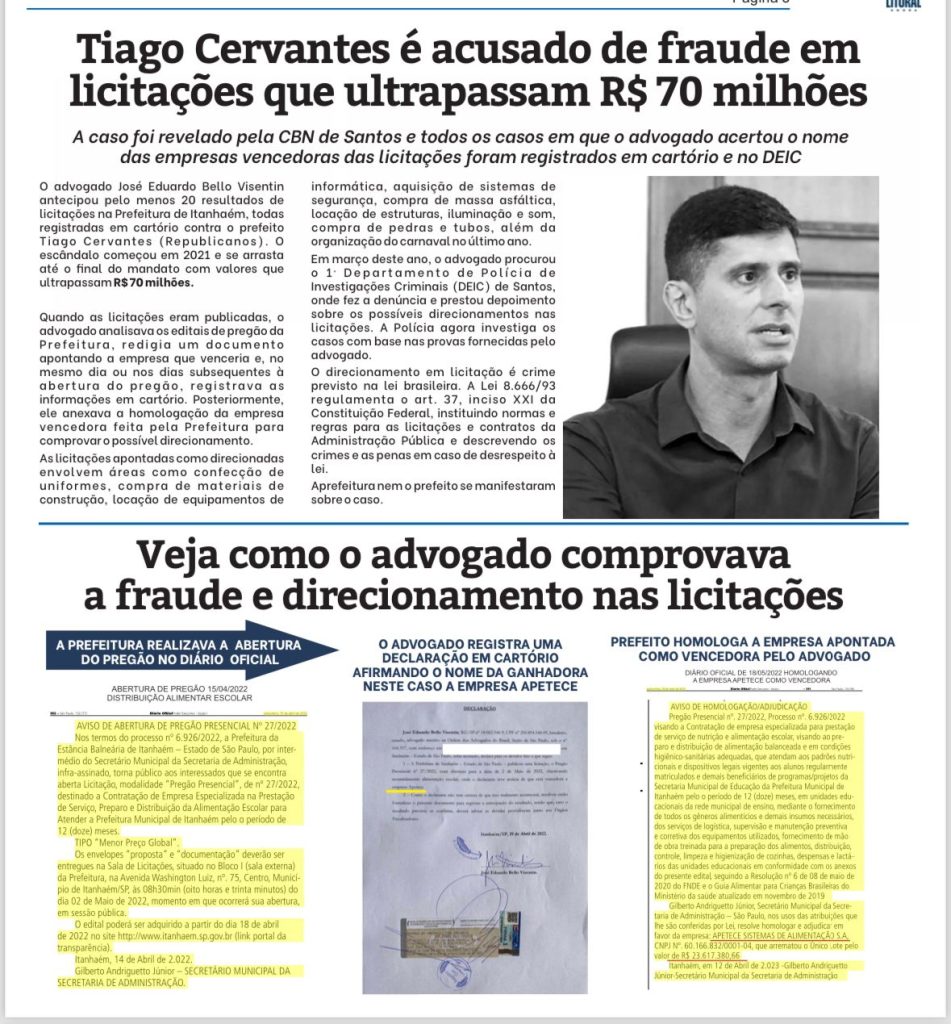 O advogado José Eduardo Bello Visentin antecipou pelo menos 20 resultados de licitações na Prefeitura de Itanhaém, todas registradas em cartório contra o prefeito Tiago Cervantes (Republicanos). O escândalo começou em 2021 e se arrasta até o nal do mandato com valores que ultrapassam R$ 70 milhões.