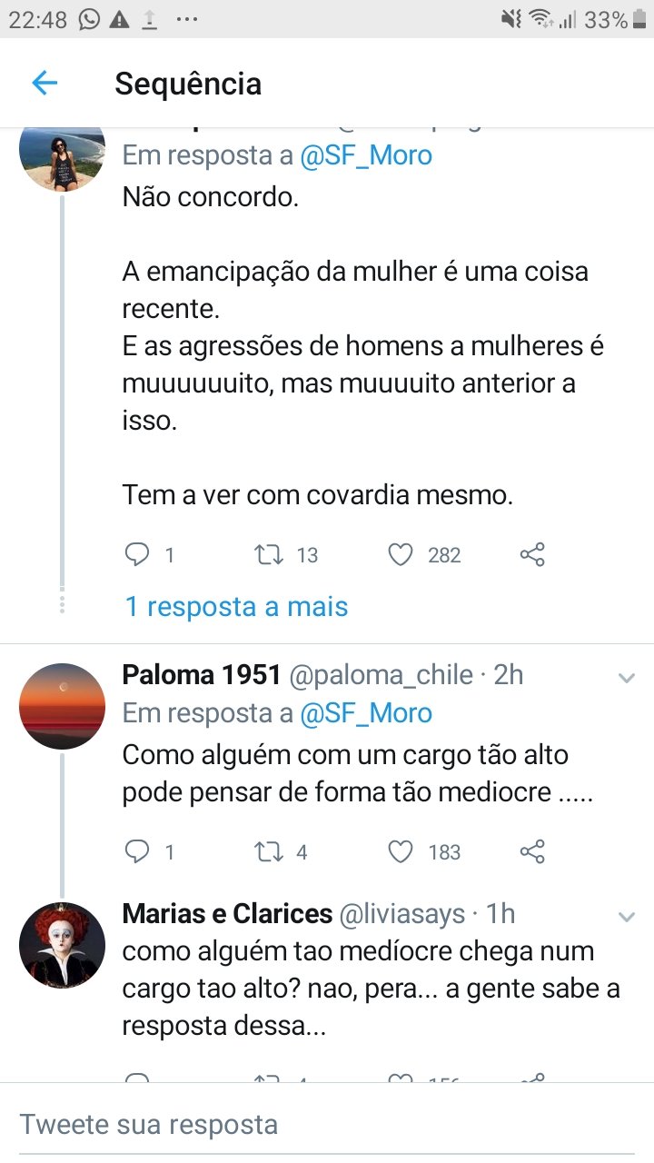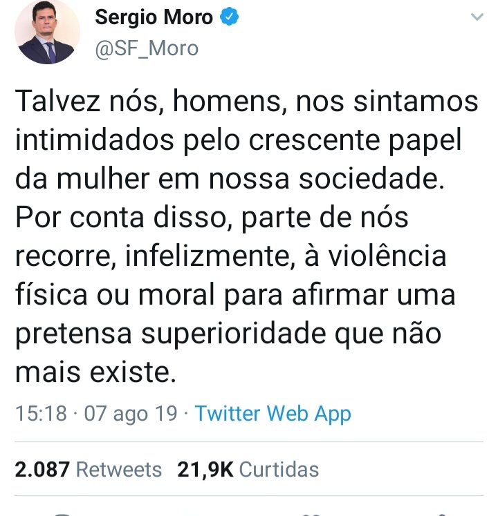 O ministro da Justiça, Sérgio Moro que tenta justificar o feminicídio e a violência contra mulher no décimo terceiro aniversário da Lei Maria da Penha gerou repercussão negativa entre as internautas.