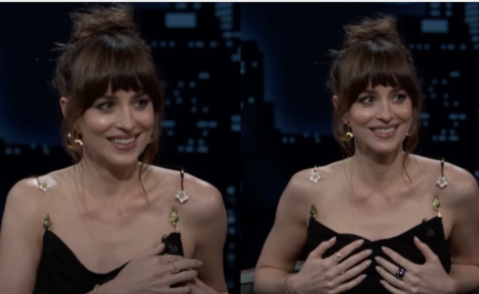 Logo após a produção do talk-show exibir um teaser do longa, as câmeras voltaram para Dakota e Jimmy Kimmel no estúdio. Neste instante, a atriz já estava com as mãos segurando o vestido para que ele não caísse de vez.